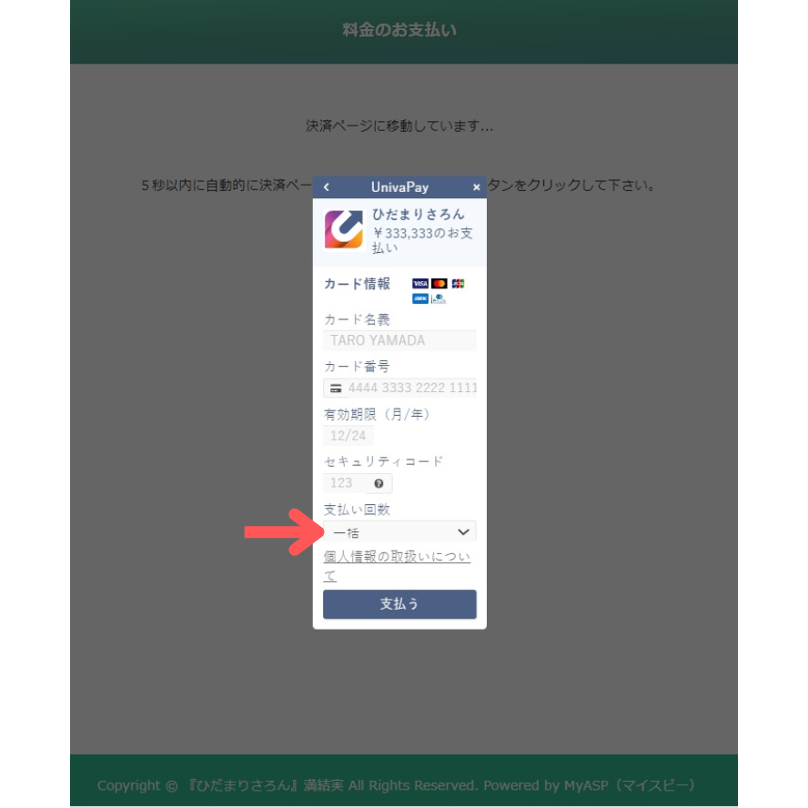 各項目の入力、支払い回数の選択、をして、『支払う』をクリック。