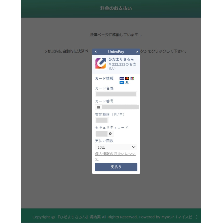 4.UnivaPayでの決済入力画面が出ます。