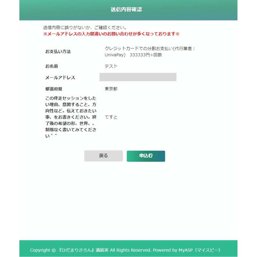 2.お申し込み送信時の確認画面。お支払方法にUnivaPayを選択していることを確認。